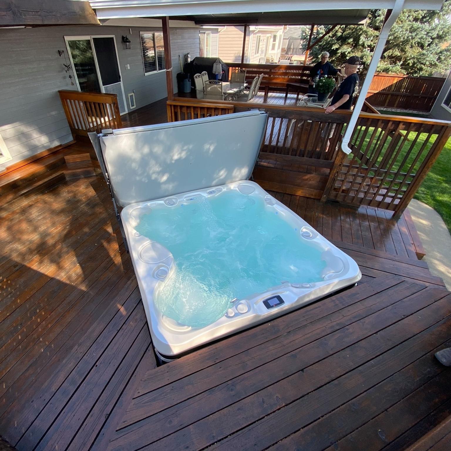Daca esti o persoana creativa, cu un simt estetic dezvoltat  si vrei ceva iesit din comun, poti opta pentru amplasarea untr-un deck de lemn.  Nu numai ca iti vei pune jacuzzi-ul in evidenta, conferindu-i eleganta, dar nu vei mai avea nevoie de scari sau balustrada pentru a intra in acesta.