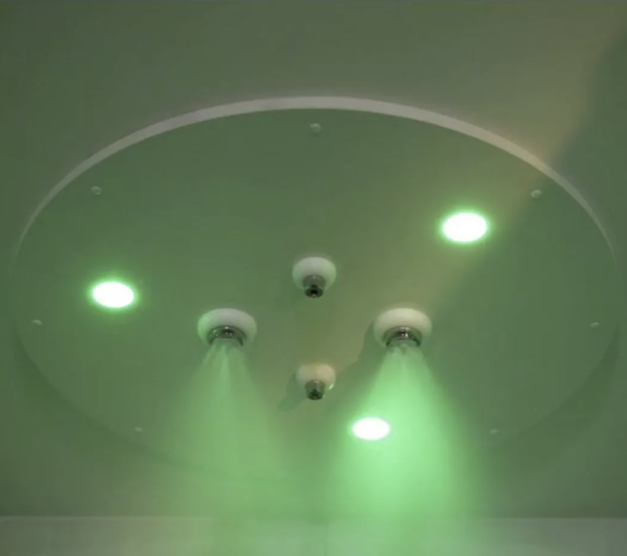 Pasul 3: Side Nozzles + Cold Fog Shower, lumină care alternează între verde și albastru, sunet de ciripit de păsărele pe fundal.