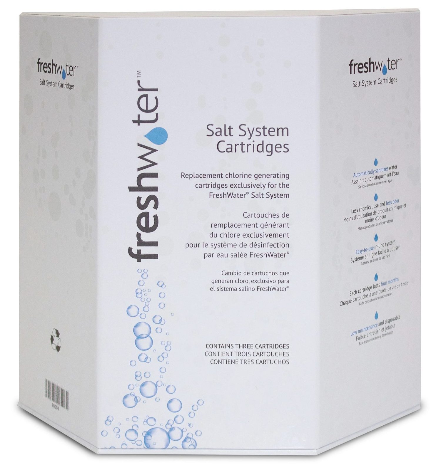FreshWater Salt System igienizează apa utilizând un cartuş de unică folosinţă care nu necesită întreţinere pentru a genera clor din sare.