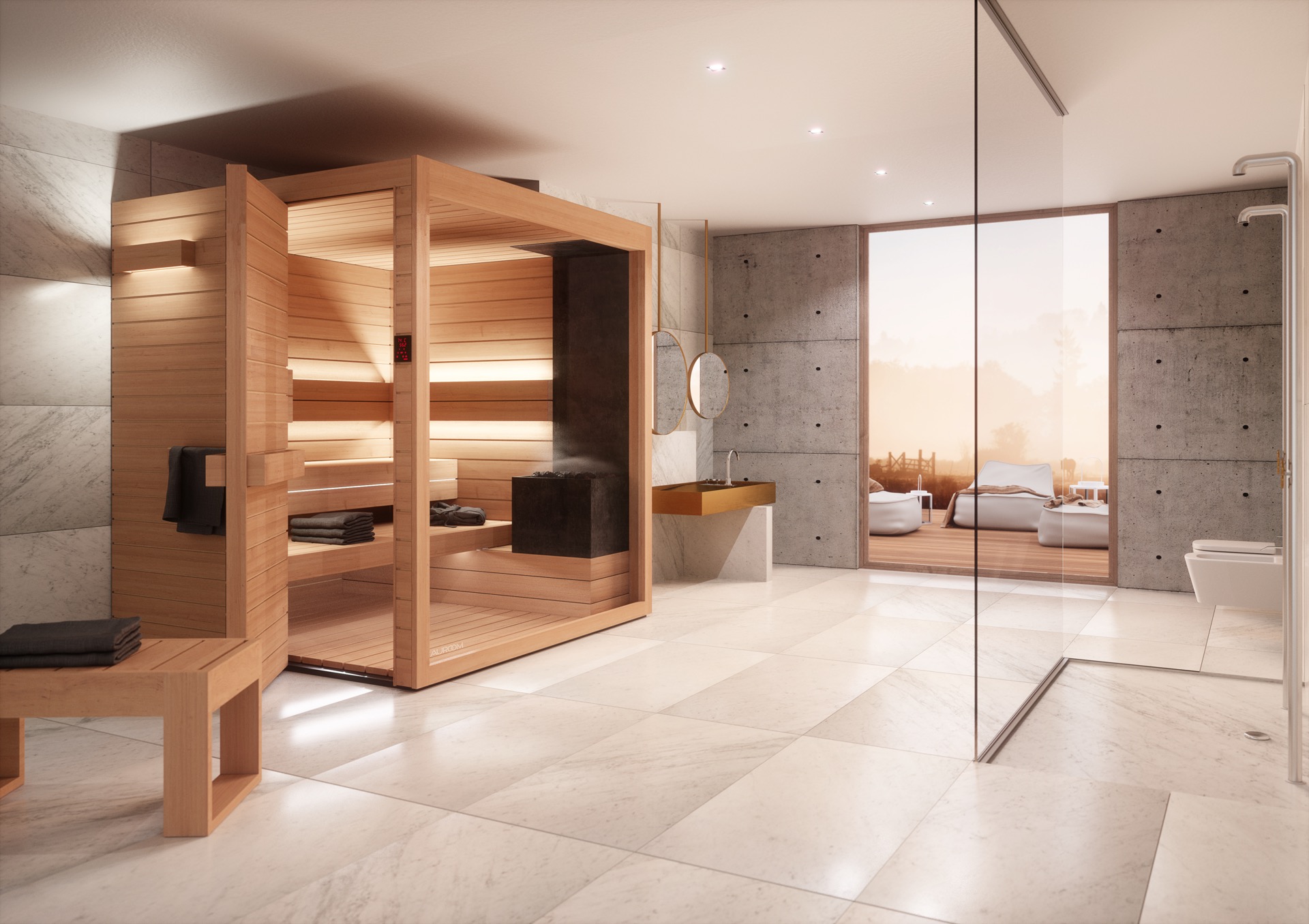 Opțiuni și accesorii Kit saună (găleată și lingură, clepsidră, termometru, termohigrometru), set 5 arome, prosop, pălărie, pernă